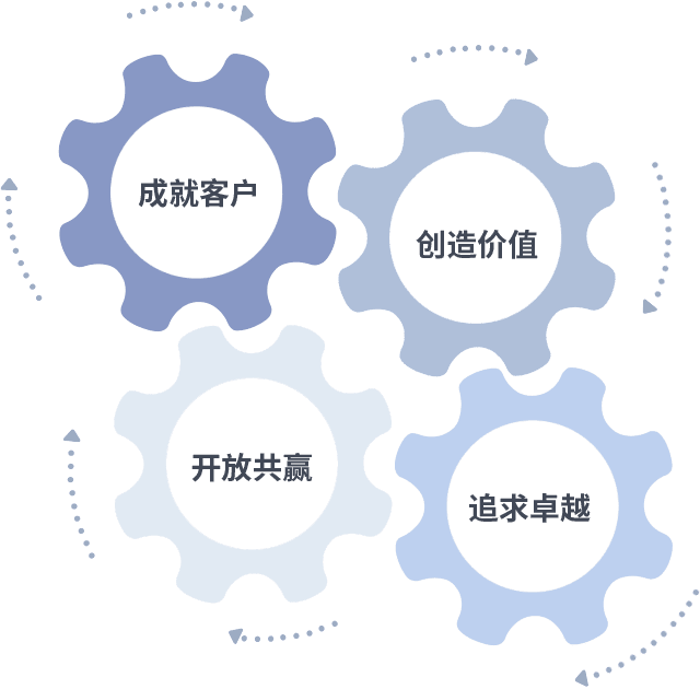 成就客户是一切决策的出发点,,,,创造价值是衡量所有工作的标准,,追求卓越是人生就是博做事做人的态度,,,开放共赢是人生就是博的格局也是最终的结果。。。。价值观的齿轮环环相扣,,推动着组织里的每个人不断向前。。